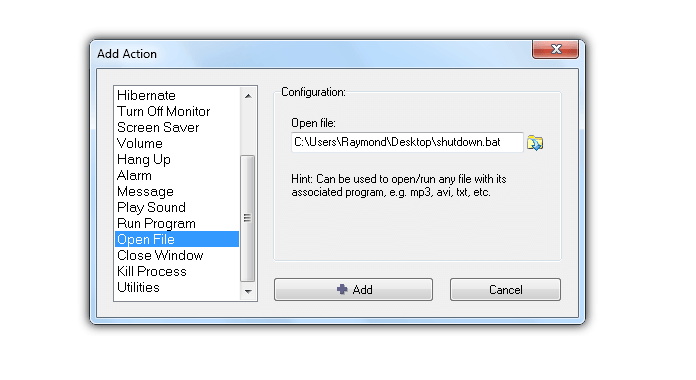 এর জন্য প্রথমেই আপনাকে add an event এ ক্লিক করতে হবে। এরপর bettery low select করতে হবে। ব্যাটারী লেভেলের পার্সেন্টেজ কমিয়ে add এ ক্লিক করুন। এরপর add action পেইজ থেকে open ফাইল সিলেক্ট করে আপনি যেই batch ফাইলটি রান করাতে চান সেটি সিলেক্ট করে add এ ক্লিক করুন। সবশেষে start বাটনে ক্লিক করুন