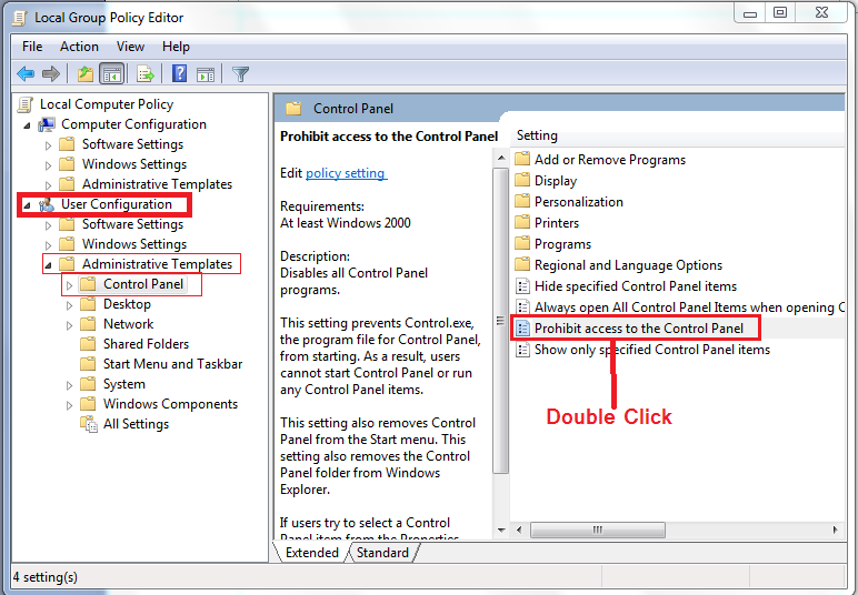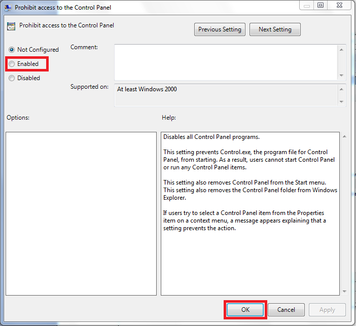 তাহলেই আপনার কন্ট্রোল প্যানেল এ সকল প্রকার এক্সেস ব্লক হয়ে যাবে।আপনি যদি কন্ট্রোল প্যানেল এ সকল প্রকার এক্সেস ব্লক করার পর পুনরায় এক্সেস করতে চান তাহলে Prohibit access to the Control Panel অপশনে ডাবল ক্লিক করে ডিজেবল করে দিন।