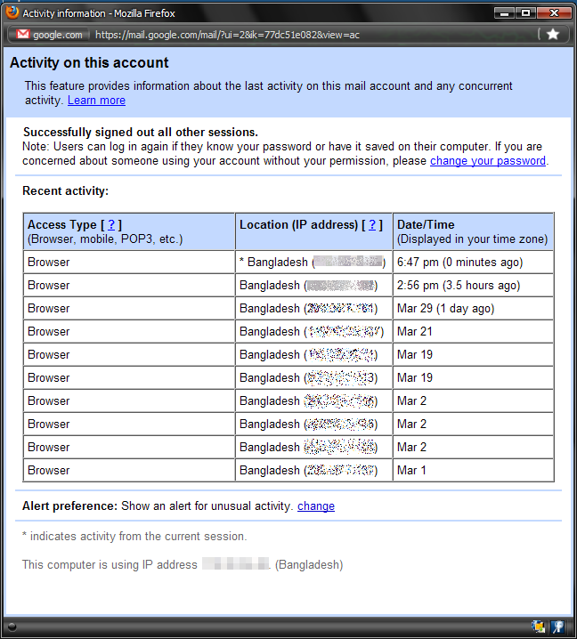 আপনার আইপি নিশ্চয় আপনার জানা? তাহলে দেখুন, অপরিচিত কোনো আইপি আছে কি না এবং পাশের দিন তারিখের সাথে মিলিয়ে দেখুন যে আপনি ঐ সময় ঢুকেছিলেন কি না। যদি কিছু গড়বড় মনে হয় তাহলে পাসওয়ার্ড চেঞ্জ করে ফেলুন।