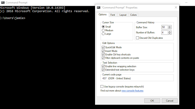 ৪৪) উইন্ডোজ ১০ এর কমান্ড প্রোমোটে রাইট বাটন ক্লিক করে প্রোপার্টিস অপশনে ক্লিক করলে আপনি নতুন কিছু অপশন সম্বলিত কমান্ড প্রোমোট প্রোপার্টিস পাবেন!