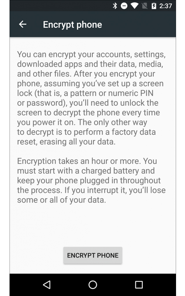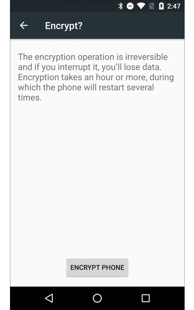 পরবর্তী স্ক্রিণে আপনাকে এনক্রিপ্টশন নিয়ে কিছু সর্তকবার্তা দেখাবে যেটা আমি আগেই আপনাদেরকে বলে রেখেছি। এবার ENCRYPT PHONE বাটনে চেপে প্রক্রিয়াটি শুরু করুন।