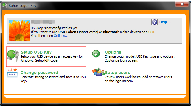 ১) প্রথমে আপনাকে Rohos Logon Key সফটওয়্যারটি ডাউনলোড এবং ইন্সটল করে নিতে হবে। এই লিংক থেকে সফটওয়্যারটি ডাউনলোড করে নিন এবং সফটওয়্যারটি লাঞ্চ করুন। একটি স্টার্টআপ উইন্ডো আসবে এবং এখান থেকে সেটআপ ইউএসবি কী ট্যাবে ক্লিক করুন।