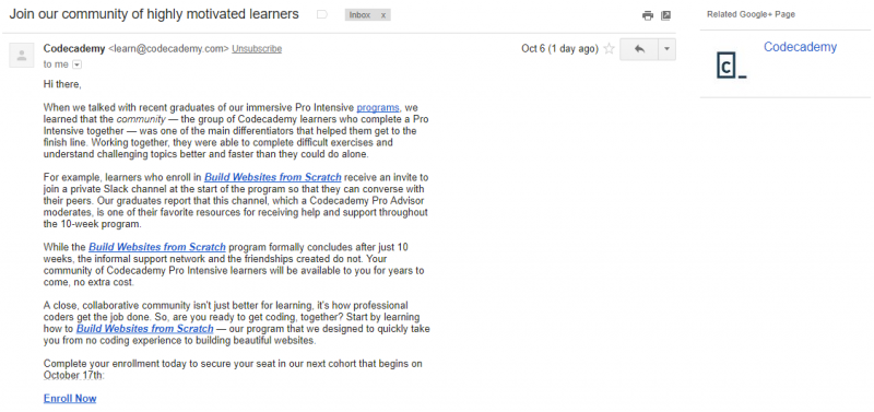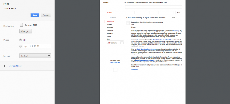 পি.ডি.এফ আকারে ইমেইল সেভ করার জন্য আমারা ব্রাউজার এর প্রিন্ট অপশনটি ব্যবহার করব। সব ব্রাউজার এবং ইমেইল সফটওয়্যারেই এই সুবিধাটি থাকে। আমরা এই কাজটি করার জন্য গুগল ক্রোম ব্যবহার করব। এর জন্য প্রথমেই আমাদের যেকোনো ইমেইল ওপেন করতে হবে ব্রাউজার এর মাধ্যমে। যেমন ধরুন আমার জিমেইলে কোড অ্যাকাডেমি থেকে একটি ইমেইল এসেছে আমি সেটি ওপেন করলাম।