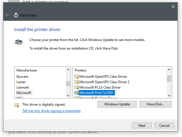 তারপরে “Choose a printer port” উইন্ডোতে আবার “next” চাপুন। এবার “Install the printer driver” নামের যে উইন্ডোটি ওপেন হবে সেখানে “Manufacturer” এর নিচে “Microsoft” সিলেক্ট করুন এবং তারপরে ডান পাশে “Printers” এর জায়গায় “Microsoft Print To PDF” নামের অপশনটি সিলেক্ট করে “Next:” চাপুন।
