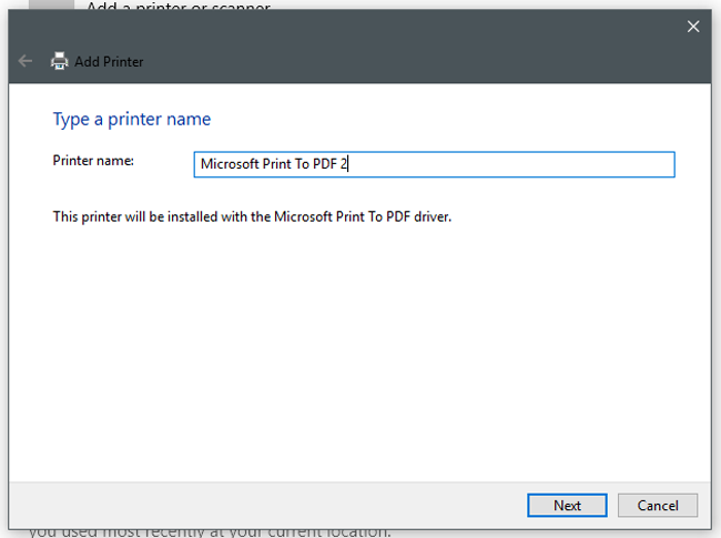 এবার পরের যে উইন্ডোটি আসবে সেখান “Next” চাপুন। এবং এরপরে আপনার তৈরি প্রিন্টার এর একটি নাম দিন। ডিফল্ট রাখলে আপনার খুঁজে পেতে সুবিধা হবে।