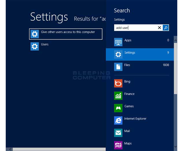 ১) উইন্ডোজ ৮.১ এর স্টার্ট স্ক্রিণে যান। এখানে এসে সার্চ বক্সে লিখুন add user তারপর সার্চ রেজাল্ট থেকে Settings অপশনটি সিলেক্ট করুন। তারপর বাম দিকের Give other users access to this computer অপশনে ক্লিক করুন।