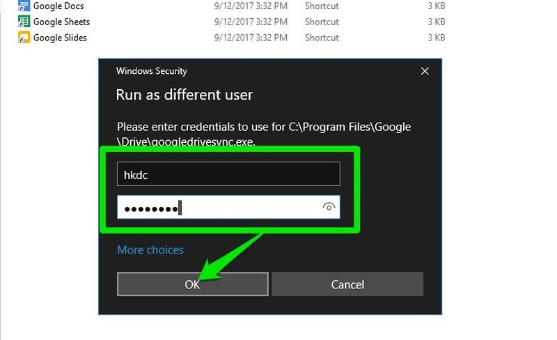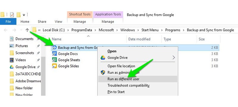 ১) Shift কী চেপে গুগল ড্রাইভ এপপ শর্টকাট আইকনে রাইট মাউসের বাটন ক্লিক করুন। এবার কনটেক্স মেনুতে দেখবে Run as different user নামের একটি নতুন অপশন এসেছে। এটায় ক্লিক করুন।