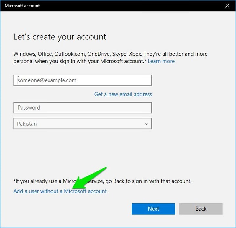 ৪) এরপর এইরকম একটি মাইক্রোসফট একাউন্ট তৈরির উইন্ডো আসবে। এখান থেকে নিচের দিকে অবস্থিত Add a use without a Microsoft account অপশনে ক্লিক করতে হবে আপনাকে।