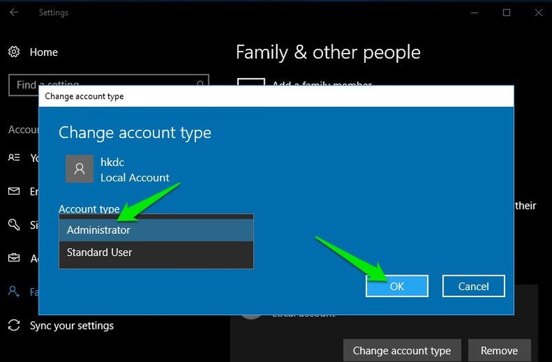 ৭) এবার Account Type ড্রপ ডাউন মেনু থেকে Administrator সিলেক্ট করুন। এবং OK বাটন ক্লিক করুন।