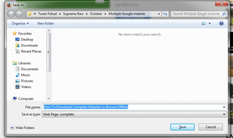 ১) আমি ফায়ারফক্স ব্রাউজারে একটি ওয়েবপেজকে সেভ করবো। এর জন্য ব্রাউজারে উক্ত পেজটি লোড করার পর কিবোর্ডের কন্ট্রোল বাটন চেপে S বাটন (Ctrl + S) চাপলাম, এবার একটি Save as উইন্ডো আসবে, এখানে আপনি আপনার পিসির কোথায় ওয়েবপেজটি সেভ করে রাখতে চান সেটি দেখিয়ে দিন এবং Save বাটনে ক্লিক করে বেরিয়ে আসনু। মনে রাখবেন, Save বাটন ক্লিক করে বেরিয়ে আসার পর ওয়েবপেজটি ডাউনলোড হতে থাকবে, আর ডাউনলোডের সময় নেট কানেক্টশন চলে গেলে কিংবা পিসি বন্ধ করে দিলে ডাউনলোড প্রক্রিয়া ব্যাহত হবে।