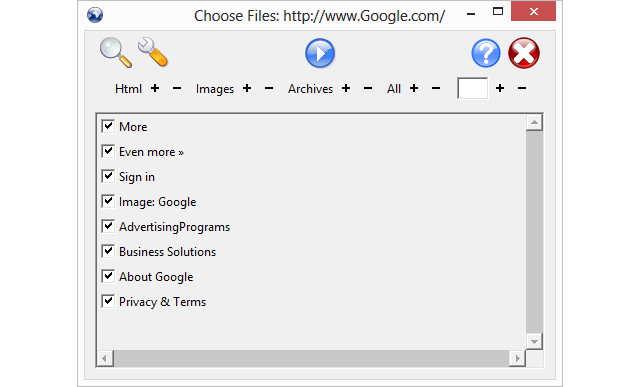 ২) এবার আপনার কাছে জানতে চাওয়া হবে সাইটটির কোন কোন ফাইলগুলো ডাউনলোড করতে চান। পছন্দ অনুযায়ী ফাইলগুলো সিলেক্ট করে মাঝের নীল প্লে বাটনে ক্লিক করে ডাউনলোড প্র্রক্রিয়াটি শুরু করুন।
