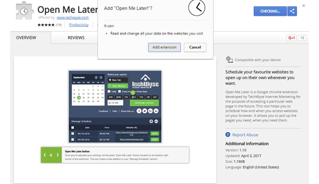 ১) প্রথমেই আপনাকে Open Me Later এক্সটেনশনটি আপনার গুগল ক্রোম ব্রাউজারে ইন্টসল করে নিতে হবে। এর জন্য গুগল ক্রোম ব্রাউজার থেকে সরাসরি এই লিংকে চলে যান। Open Me Later ক্রোম এক্সটেনশনটি TechWyse Internet Marketing এর দ্বারা নির্মিত হয়েছে এবং এটি ব্যবহারের মাধ্যমে আপনি ভবিষ্যতে ওয়েবসাইটে একসেস পাবার জন্য শিডিউল করে রাখতে পারবেন।