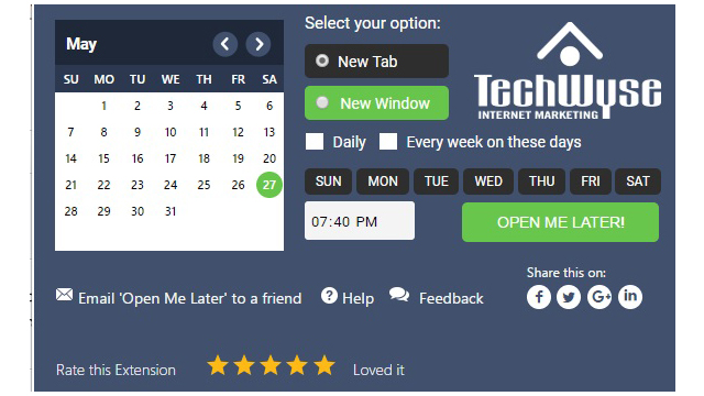 ২) এক্সটেনশনটি ইন্সটল হয়ে গেলে গুগল ক্রোম ব্রাউজার টি রিস্টার্ট দিন। রিস্টার্ট দেবার পর লক্ষ্য করে দেখবেন যে আপনার ক্রোম ব্রাউজারের টাস্কবারে একটি নতুন আইকন যুক্ত হয়েছে। এবার আপনার কাজ হলো আপনি যে ওয়েবসাইটি শিডিউল করে রাখতে চান সেটা ব্রাউজ করুন। কাঙ্খিত ওয়েবসাইটটি ওপেন করার পর এক্সটেনশন আইকনে ক্লিক করুন। একটি নতুন পপ আপ উইন্ডো আসবে। এবার এখানে এসে বাম দিকে দেখবেন একটি ক্যালেন্ডার রয়েছে, আর বাম দিকে কয়েকটি অপশন রয়েছে। এখানে এসে আপনার পছন্দমত দরকারি সেটিং করে নিন। সেটিং করা হয়ে গেলে OPEN ME LATER বক্সে ক্লিক করে বেরিয়ে আসুন! ব্যাস! কাজ শেষ!
