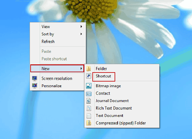 ধাপ ১ঃ ডেস্কটপের কোনো ফাঁকা স্থানে রাইট ক্লিক (Right click) করুন, তারপর প্রসঙ্গ মেনু (Context menu) থেকে নিউ (New) নির্বাচন করুন এবং সাব-তালিকায় শর্টকাট (Shortcut) নির্বাচন করুন।