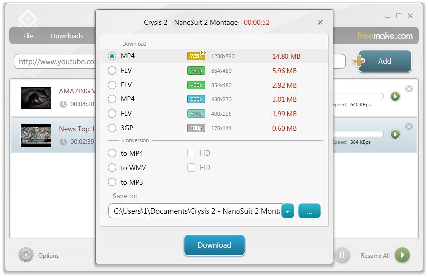 ফ্রিমেইক এর ওয়েবসাইট এর ভাষ্য অনুযায়ী এই সফটওয়্যারটি প্রায় ১০০০০ এর বেশি সাইট থেকে ভিডিও নামাতে পারে এবং বিশ্বব্যাপী প্রায় ৮৩ মিলিয়ন ইউজার এদের রয়েছে। যাই হোক ফ্রিমেইক ভিডিও ডাউনলোডার দিয়ে আপনি ইউটিউব থেকে যেকোনো ফরম্যাটের জন্য ভিডিও নামাতে পারবেন। সফটওয়্যারটি দিয়ে একই সাথে একাধিক ইউটিউব ভিডিও নামানোর সুযোগ রয়েছে। ফ্রি এই সফটওয়্যারটির ব্যবহারের মাঝেমধ্যে এটি আপনাকে বিভিন্ন এড দেখাবে! তবে ইউটিউব ভিডিও থেকে শুধু অডিও নামাতে চাইলে আপনাকে অন্য আরেকটি সফটওয়্যার Freemake YouTube to MP3 Boom ব্যবহার করতে হবে।