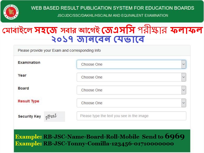 যে কোন মোবাইল অপারেটর এর মেসেজ অপশন এ গিয়ে লিখতে হবে RB এরপর স্পেস দিয়ে JSC তারপর স্পেস দিয়ে আপনার Name স্পেস দিয়ে আপনার Board এর নাম এরপর, আর একটি স্পেস দিয়ে আপনার Roll নম্বরটি লিখুন। এবার একটি স্পেস দিয়ে আপনার Mobile নাম্বার লিখে মেসেজ টি ৬৯৬৯ নম্বরে পঠিয়ে দিন।