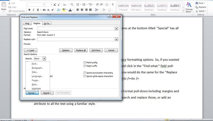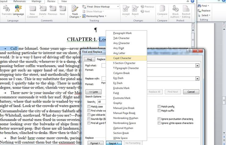 এর জন্য Find and Replace এর নিচের দিকে Special ড্রপ আপ মেনুতে ক্লিক করুন।