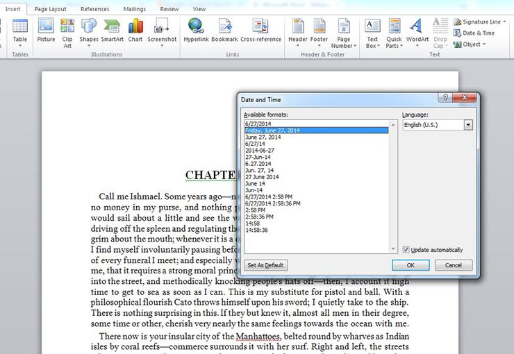 এরজন্য Insert ট্যাবের আন্ডারে Date & Time বাটনে ক্লিক করুন। একটি পপ আপ উইন্ডো আসবে। এখান থেকে আপনার পছন্দের ডেট ফরম্যাটে ক্লিক করুন এবং লক্ষ্য রাখবেন যে update automatically বক্সটিতে টিক চিহ্ন দেওয়া রয়েছে কিনা। এরপর থেকে প্রতিবার কোনো ডুকুমেন্ট চালু করার পর ডেট এবং টাইম অটোমেটিক্যালি আপডেট হতে থাকবে।