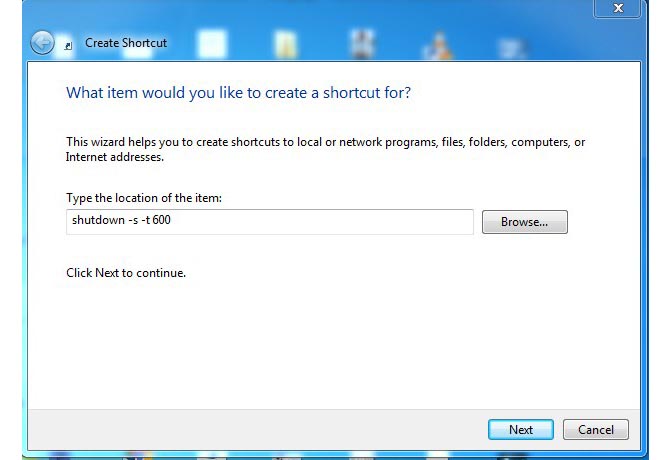 > এবার Type the location of the item বক্সে এই কমান্ডটি লিখুন shutdown -s -t 600। এখানে 600 বলতে ৬০০ সেকেন্ড বুঝানো হয়েছে। মানে কমান্ডটি দেবার ১০ মিনিট পর আপনার পিসিটি অটো শাটডাউন হয়ে যাবে। এখানে শুধু আপনি সেকেন্ড অনুসারে কমান্ড দিতে পারবেন। তাই ১০x৬০ = ৬০০ সেকেন্ড এভাবে আপনাকে হিসেব করে নিতে হবে।