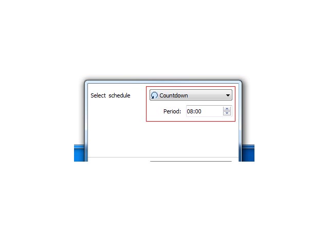 > এবার এখানে এসে আপনাকে Select Schedule ড্রপ ডাউন মেনু থেকে Countdown অপশনটি সিলেক্ট করতে হবে এবং নিচের Period বক্সের আপনার পছন্দের টাইমটি সিলেক্ট করে দিন যখন আপনি পিসিটিকে অটো শাট ডাউন করাতে চান।
