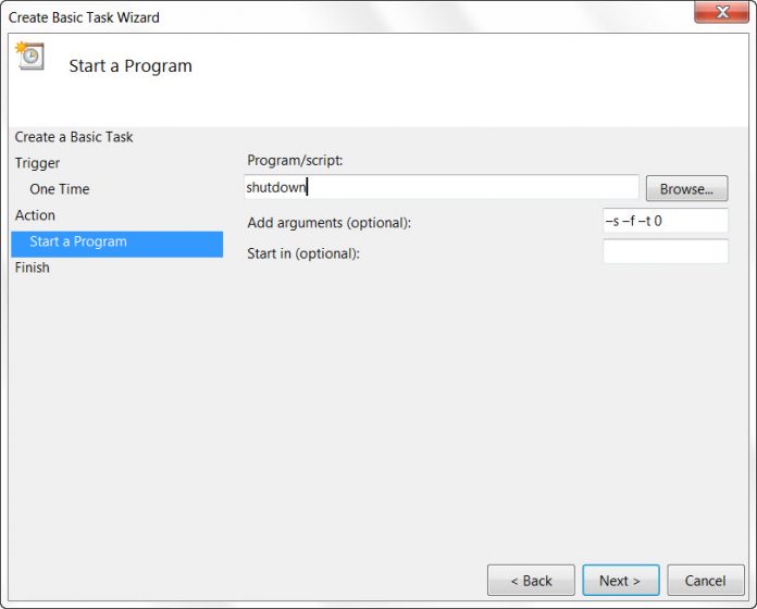 > এবার এই উইন্ডোতে এসে আপনাকে Program/script বক্সে লিখতে হবে shutdown আর Add arguments বক্সে লিখতে হবে -s -f -t 0। আগের পদ্ধতির মতোই এখানেও সেকেন্ড হিসেবে লেখতে হবে। এক মিনিট পর পিসি শাট ডাউন দিতে চাইলে 0 এর জায়গায় লিখুন 60।