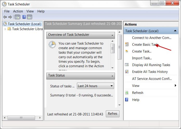 > দেখবেন যে টাস্ক শিডিউলার উইন্ডোটি চলে এসেছে। এখন আপনাকে Create Basic Task একশনে ক্লিক করতে হবে।