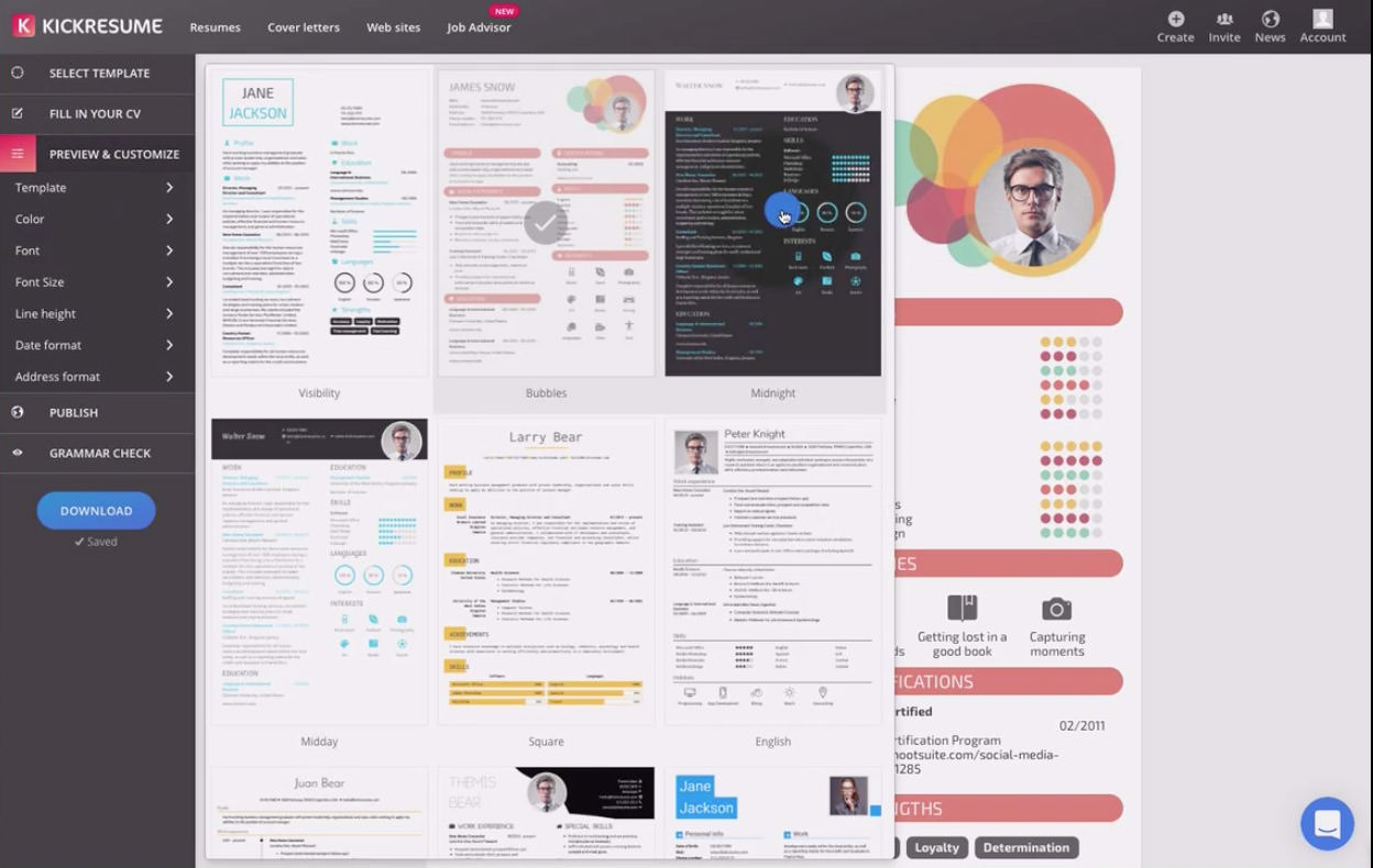 Kickresume আপনাকে অনেকগুলো সিভি ও কভার লেটার খসড়া ডিজাইন অফার করবে এবং এর মধ্য থেকে আপনি আপনার জবের প্রয়োজন মাফিক ডিজাইনকে বেছে নিতে পারবেন। এছাড়াও আপনি এখানে আপনার পছন্দকৃত সিভি ডিজাইনের কাস্টম রং, আইকন এবং লেআউটও এডিট করে নিতে পারবেন। এছাড়াও এর প্রিমিয়াম সাবস্ক্রিপশনের মাধ্যমে আপনি এর মাধ্যমে আপনার একটি প্রফেশনাল সিভি ও কভার লেটার তৈরি করে নিতে পারবেন। তবে এর ফ্রি সংস্করণটিতে আপনি সীমিত সংখ্যক ডিজাইন এবং সিভি তৈরি করতে পারবেন।