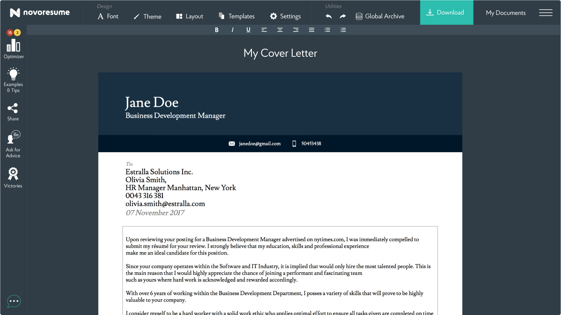 অনান্য সাইটের থেকে Novoresume এর সিভির কনটেন্সকে বেশি গুরুত্ব দিয়ে থাকে এর ডিজাইনের থেকে। এখানে আপনি ডিজাইনের থেকে আপনার সিভির কনটেন্টকে আরো বেশি শক্তিশালি করতে পারবেন। সাইটে রয়েছে একটি বিল্ট ইন কনটেন্ট অপটিমাইজার সেটির সাহায্যে আপনি আপনার সিভিকে স্ক্যান করিয়ে নিয়ে কিভাবে আপনার সিভির কনটেন্টকে আরো সুন্দর এবং পাঞ্চুয়াল করা যায় সেটির ব্যাপারে সাহায্য পেতে পারবেন। সাইটি দিয়ে আপনি অনেকগুলো ভিন্ন ভাষায় সিভি তৈরি করতে পারবেন তবে এখানে কোনো pre-written phrases নেই। আর সাইটটি ফ্রি সংস্করণে আপনি প্রি ডিফাইন্ড লেআউট দিয়ে একটি এক পৃষ্ঠার সিভি তৈরি করতে পারবেন।