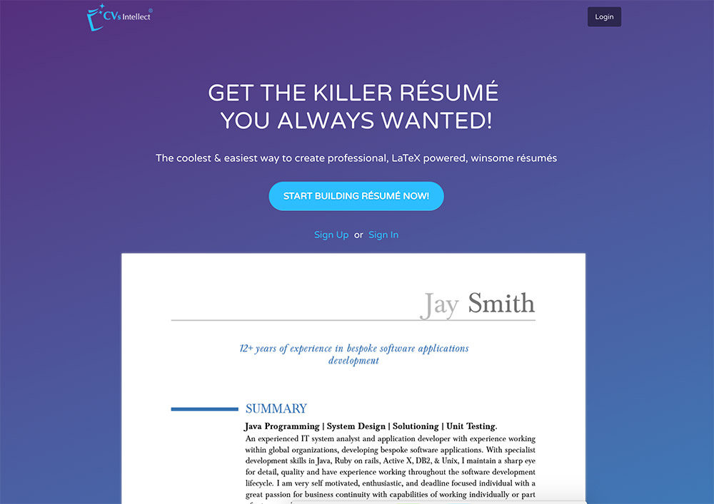 CVsIntellect দিয়ে আপনি কয়েক মিনিটে একটি প্রফেশনাল সিভি তৈরি করে ফেলতে পারবেন কারণ এতে রয়েছে intuitive interface এবং রয়েছে Pre-built templates এবং ফ্রন্টস যার মাধ্যমে আপনি আপনার সিভির ডিজাইনকে ইউনিক করে নিতে পারবেন সহজেই। শুধুমাত্র একটি সিভি ডিজাইন নির্বাচন করে, আপনার তথ্য ইনপুট করে এবং লেআউট এডিট করেই আপনি একটি প্রফেশনাল সিভি বানিয়ে নিতে পারবেন আধা ঘন্টার মধ্যেই।