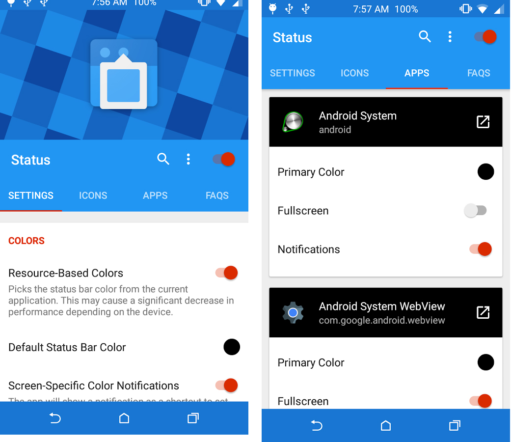 আপনি রুট ছাড়াই আপনার স্ট্যাটাস বার কাস্টমাইজ করতে পারবেন। যেমন আপনার ডিভাইসের ঘড়িকে বাম দিক থেকে মাঝ খানে কিংবা ডান পাশে সরিয়ে আনতে পারেন, ব্যাটারি আইকনটি পরিবর্তন করতে পারেন ইত্যাদি। এর জন্য আপনার প্রয়োজন হবে Status নামের একটি এপপের। তবে এটি সবসময় চালানো থাকবে তাই কম র্যাম যুক্ত ডিভাইসে এটি না চালানোই উত্তম।