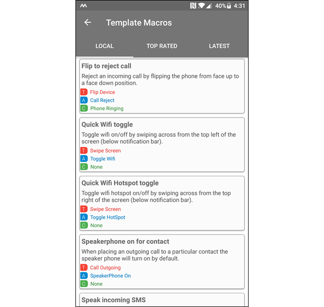 এই এপপটির ব্যবহারের মাধ্যমে আপনি আপনার ডিভাইসের অনেকগুলো টাস্ককেই অটোমেট করে নিতে পারবেন। যেমন ডিভাইসকে ফ্লিপ করে কোনো ইনকামিং কলকে রিজেক্ট করে দিতে পারেন, ডিভাইসের নোটিফিকেশন বারে আঙ্গুল দিয়ে সোয়াইপ করলে অটোমেটিক ওয়াই ফাই চালু হবে, ঝাঁকুনি দিয়ে আপনি ফোনটিকে আল্ট্রা পাওয়ার সেভিং মোডে নিয়ে আসতে পারবেন কিংবা হেডফোন প্লাগ ইন করা মাত্রই মিউজিক প্লেয়ার এপপটি চালু হবে ইত্যাদি। এসকল কাজই আপনি আপনার ডিভাইসের ওয়ারেন্টি সুরক্ষিত রেখে করতে পারবেন।
