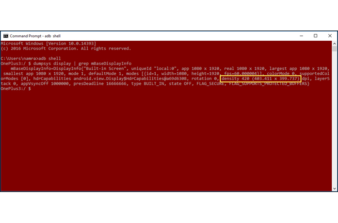 ৪) তারপর আপনার পিসির কমান্ড প্রোমোট চালু করুন এবং লিখুন adb shell আর এন্টার দিন। এখানে হলুদ বক্সে মার্ক করা density অংশটি আপনি অন্য কোথাও সেভ করে রাখুন, এটি আপনার ডিভাইসের বর্তমান এবং ডিফল্ট রেজুলেশন সাইজ। যেটা ভবিষ্যৎতে কাজে লাগতে পারে।