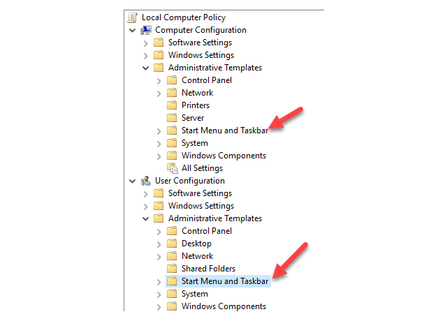 ১) প্রথমে Start মেন্যুতে ক্লিক করুন। সার্চবক্সে লিখুন gpedit.msc লিখুন আর এন্টার দিন। Local computer policy উইন্ডোজ আসলে বাম দিকের প্যানেল থেকে User Configuration কে এক্সপেন্ড করুন, সেখান থেকে Administrative Templates > Start Menu and Taskbar ধাপে চলে আসুন।