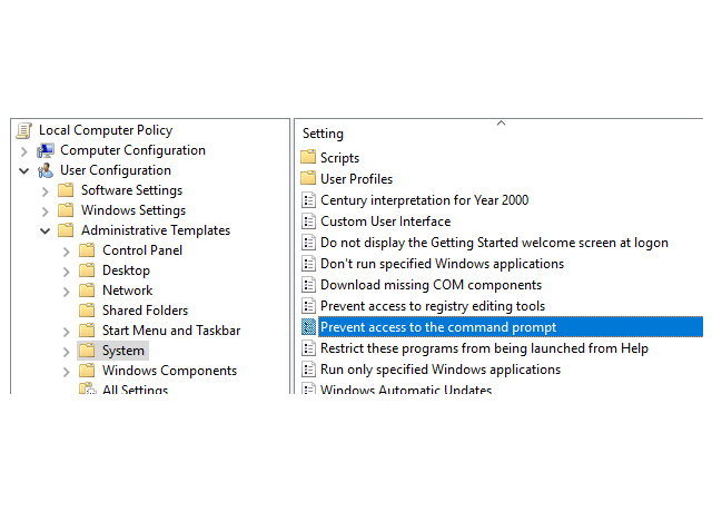 User Configuration > Administrative Templates > System এ যান এবং এখান থেকে Prevent access to the command prompt পলিসিতে ডাবল ক্লিক করে Enabled করে দিয়ে আসুন।