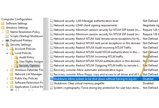 Computer Configuration> Windows Settings > Security Settings > Local Policies > Security Options থেকে নিচের দিকে স্ক্রল করে Shutdown: Allow the system to be shutdown without having to log on অপশনটিকে ডাবল ক্লিক করে Disabled করে দিয়ে আসুন।