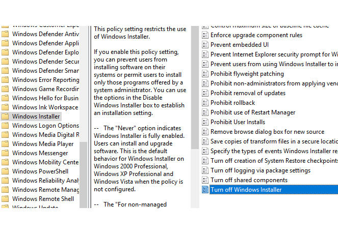 Computer Configuration > Administrative Templates > Windows Components > Windows Installer থেকে Disable Windows Installer or Turn off Windows Installer পলিসিতে ডাবল ক্লিক করে Enable করুন এবং ড্রপডাউন বক্স থেকে Always টি নির্বাচন করে দিন। ব্যাস হয়ে গেল!
