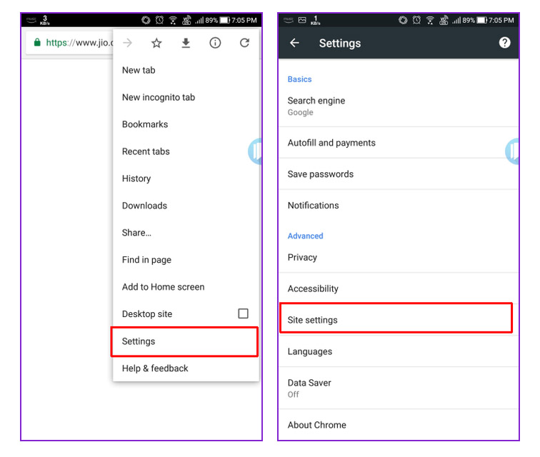 প্রথমে গুগল ক্রোম চালু করুন। এবার ডান দিকের তিনটি ডট অংশে ক্লিক করে মেন্যু চালু করুন এবং এখান থেকে সেটিংস > সাইট সেটিংস এ যান।