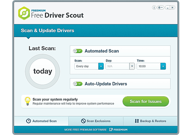 ফ্রি ড্রাইভার স্কাউট সফটওয়্যারটি আমাদের আজকের লিস্টের ২য় স্থানে রয়েছে। সফটওয়্যারটি আপনাকে অটোমেটিক আপডেটের পূর্ণ স্বাদ দিবে। কারণ এতে রয়েছে True Automatic Updating সিস্টেম। মানে হলো এই প্রোগ্রামটি আপনার পিসির ড্রাইভারগুলোকে নিয়মিত স্ক্যান করবে, কোনো ড্রাইভার আপডেট এলে সেটা স্বয়ংক্রিয় ভাবে ডাউনলোড করবে এবং স্বয়ংক্রিয় ভাবেই সেটা ইন্সটল করে দেবে। এছাড়াও আপনার পিসির কোনো নির্দিষ্ট ড্রাইভারকে আপনি স্ক্যানিং এরিয়ার থেকে বাদ দিয়ে রাখতে পারবেন, এতে করে প্রয়োজন না পড়লে সেটা আর অটো আপডেট হবে না।