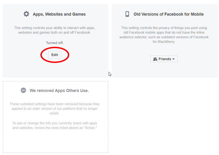 আপনি যদি আপনার ফেসবুক একাউন্টটি নিউক্লিয়ার সুরক্ষায় সুরক্ষিত রাখতে চান তাহলে যাবতীয় সকল থার্ড পার্টি অ্যাপস এবং ওয়েবসাইটগুলোকে আপনার ফেসবুক একাউন্ট দিয়ে ব্যবহার করা বন্ধ করতে পারেন। এজন্য ডেক্সটপে থাকা অবস্থায় চলে যান সেটিংস মেন্যুতে, সেখান থেকে Apss and Websites পেজে গিয়ে নিচের দিকে স্ক্রল ডাউন করে আসুন। Apps, Websites, and Games নামের একটি বক্স পাবেন। এটার নিচে দেখবেন Turned On বলা রয়েছে। এবার আপনি চিত্রে দেখানো মতো Edit বাটনে ক্লিক করুন। একটি পপ আপ আসবে