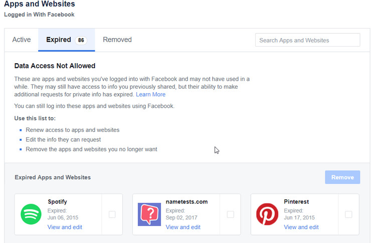 একটিভ ট্যাবের পাশেই রয়েছে Expired ট্যাব। সেখানে ক্লিক করে চলে আসুন। এখানে যেসকল অ্যাপস এবং ওয়েবসাইটের লিস্ট দেখতে পাবেন সেগুলো হচ্ছে আপনার একাউন্ট দিয়ে খোলা সকল অ্যাপস ও সাইটের লিস্ট যেগুলোর লগইন ইনফো Expired হয়ে গিয়েছে। এগুলোকেও আপনি এক এক করে রিমুভ করে দিন। কারণ এগুলো এমনিতেই কাজে লাগবে না। তবে এটা আপনার একাউন্টের সাথে সংযুক্ত থাকলে বিপদের চান্স থেকে যায়। এছাড়াও একটিভ ট্যাবের মতোই প্রতিটি এন্টির নিচের View and edit লিংকে ক্লিক করে এতদিন এগুলোর সাথে আপনি কি কি তথ্য শেয়ার করে আসছিলেন সেটাও দেখতে পারবেন।