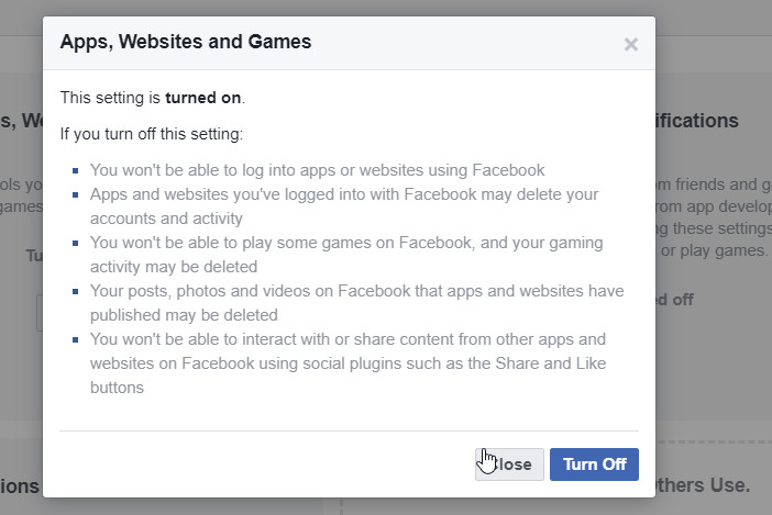 এখান থেকে আপনি Turn Off বাটনে ক্লিক করে এই সার্ভিস করে একদম বন্ধ করে দিতে পারবেন। এর মাধ্যমে এখন থেকে আপনার ফেসবুক একাউন্টের কোনো ডাটা এবং তথ্যগুলো কোনো থার্ড পার্টি অ্যাপ এবং সাইটের সাথে শেয়ার হবে না। তবে একই সাথে আপনি আর নতুন করে কোনো সাইট বা অ্যাপে ফেসবুক একাউন্ট দিয়ে লগইন বা রেজিস্টার করতে পারবেন না (যা করা উচিত নয়)