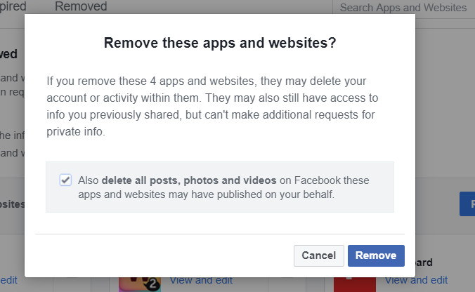 একটিভ লিস্ট থেকে কোনো সাইট এবং অ্যাপস রিমুভ করার সময় আপনি এই ওয়ানিংটি পাবেন। লিস্ট থেকে অ্যাপস এবং সাইটগুলো মুছে দিলে উক্ত অ্যাপ এবং সাইট থেকে আপনার একাউন্টের এক্টিভিটিগুলোও, একাউন্টটি মুছে যাবে। একই সাথে এই অ্যাপস বা সাইট রিলেটেড কোনো টিউন, ছবি বা অনান্য তথ্য আপনার ফেসবুক একাউন্টে থেকে থাকে তাহলে নিচের বক্সে টিক দিয়ে সেগুলোকেও আপনি একেবারে মুছে দিতে পারেন।