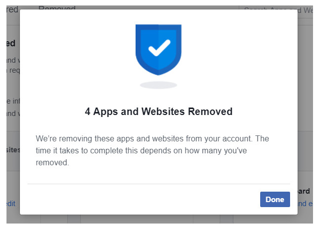 এই পদ্ধতিতে কোনো সাইট এবং অ্যাপস মুছে দেওয়ার পর আপনি এই কনফার্মেশন স্ক্রিণটি পাবেন। এখানে আপনি অ্যাপস এবং সাইটের সংখ্যা অনুযায়ী ফেসবুক সময় নিয়ে উক্ত সাইট ও অ্যাপসগুলোকে মুছে দেবে।