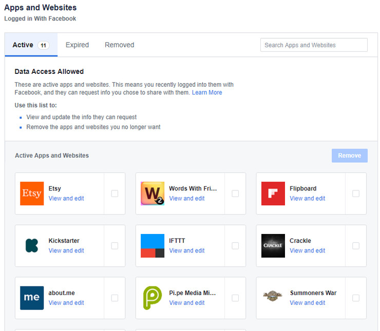 এখানে এসে একটিভ ট্যাবে আপনি আপনার একাউন্ট থেকে রেজিস্ট্রিকৃত বিভিন্ন ওয়েবসাইট এবং অ্যাপসের লিস্ট দেখবেন। এগুলোকে ভালো করে চেক করুন। এদের মধ্যে কোনোটিকে দরকার না হলে এবং আপনি নিজে এদের কোনোটিকে না চিনে থাকলে এন্ট্রিগুলোর পাশের চেকবক্সে ক্লিক করে Remove বাটনে ক্লিক করুন এবং উক্ত ওয়েবসাইট ও অ্যাপসগুলোকে আপনার একাউন্ট থেকে মুছে দিন। এবং প্রয়োজন না হলে ফেসবুকের একাউন্ট দিয়ে অন্যত্র কোথাও লগইন করা থেকে বিরত থাকুন।