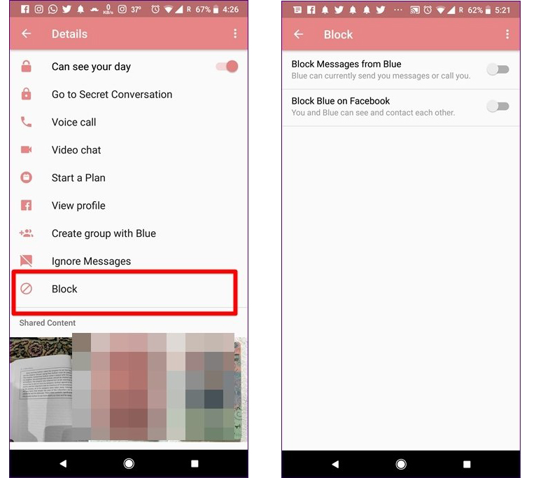 এই দুটি ব্লক অপশনে যাবার জন্য চ্যাটের উপরের (i) বাটনে ট্যাপ করুন। নিচের দিকে স্ক্রল ড্রাউন করে যেয়ে Block অপশনে ট্যাপ করুন। পরবর্তী স্ক্রিণে এই দুটি ব্লক অপশন আপনি দেখতে পারবেন। উল্লেখ্য যে ফেসবুক ব্লক আনব্লক করতে হলে ৪৮ ঘন্টা আপনাকে অপেক্ষা করতে হবে। কিন্তু মেসেঞ্জারে আনব্লক করে পুনরায় ব্লক করার জন্য কোনো সময় অপেক্ষা করতে হবে না।
