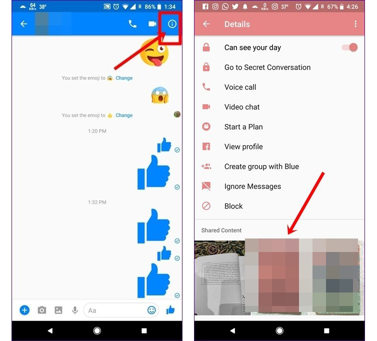 কারো সাথে শেয়ারকৃত মিডিয়া ফাইলস দেখার জন্য উক্ত চ্যাট থ্রেডটি ওপেন করুন। এবার উপরের (i) আইকনে ট্যাপ করুন। এবার নিচের দিকে স্ক্রল করে যেতে থাকুন দেখবেন Shared Content বক্সে এ পর্যন্ত যতগুলো ছবি এবং ভিডিও শেয়ার করেছেন সেগুলো আপনি দেখতে পারবেন।