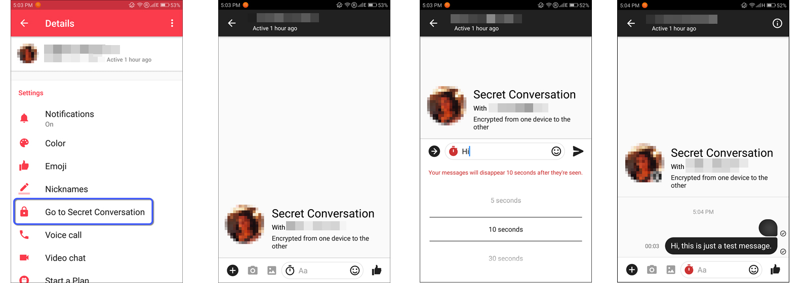 ৩) এবার যার সাথে সিক্রেট চ্যাটিং করতে চান চ্যাট থ্রেড খুলুন। উপরের (i) আইকনে ট্যাপ করুন। এবার অপশনগুলোর মাঝে আপনি Secret Conversation অপশনটি দেখতে পারবেন; এখানে ক্লিক করুন। কালো রংয়ের থিমযুক্ত আলাদা একটি চ্যাট থ্রেড চালু হবে। নিচের টেক্স বক্সের পাশে দেখবেন একটি টাইমার আইকন চালু হয়েছে।