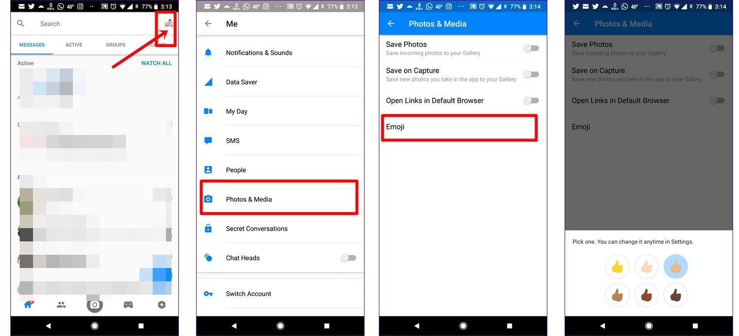 ওয়ার্টস অ্যাপে যেমন আপনি ইমোজির রং আপনার পছন্দমতো করে সেট করে নিতে পারতেন, এখন সেটা আপনি ফেসবুক মেসেঞ্জারেও সেট করে নিতে পারবেন। ফেসবুক মেসেঞ্জারে ইমোজি রং পরিবর্তন করার জন্য আলাদা কালার সেটিংস রয়েছে। এখানে ইমোজির জন্য আপনি সে রং নির্বাচন করবেন সেটা সকল ইমোজিতেই প্রয়োগ হয়ে যাবে। ইমোজির কালার সেট করতে চাইলে প্রথমে মেসেঞ্জারের উপরের ডান দিকে আপনার প্রোফাইন পিকচারে ট্যাপ করুন।