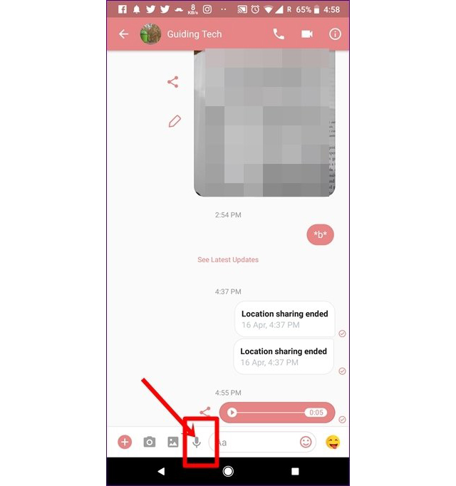 ভয়েস রেকর্ডি তৈরি করার জন্য, চ্যাট খুলে নিচের দিকের mic আইকনে প্রেস করে হোল্ড করে রাখুন, এবার ভয়েস রেকর্ড করতে থাকুন এবং হোল্ড ছেড়ে দিয়ে রেকর্ডটি সেন্ড করে দিন। রেকর্ডিংয়ের মাঝে এটা ডিলেট করতে চাইলে হোল্ড করা অবস্থায় উপরের দিকে ড্রাগ করে Cancel করে দিন।