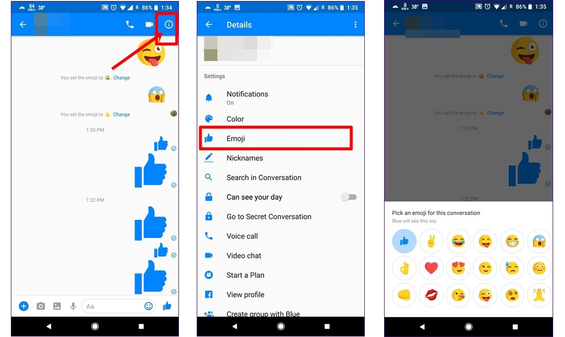 ইমোজি পরিবর্তন করতে চাইলে চ্যাট থ্রেডকে ওপেন করুন, উপরের ডান দিকের কর্নারের (i) আইকনে প্রেস করুন। অনেকগুলো সেটিংস আসবে। সেখান থেকে Emoji অপশনটিতে প্রেস করুন। এবার আপনার পছন্দমতো ইমোজি বেছে নিন। আরো ইমোজি পেতে বাম দিকে সোয়াইপ করুন।